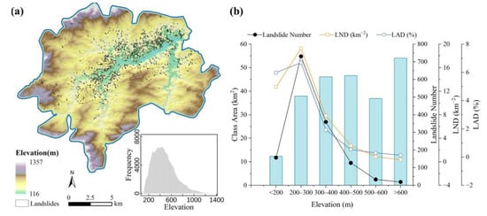 Relationship between elevation and landslide distribution: (a) Elevation distribution in the study area; (b) Statistical analysis of LND and LAD.