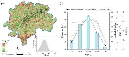 Relationship between slope and landslide distribution: (a) Slope distribution in the study area; (b) Statistical analysis of LND and LAD.