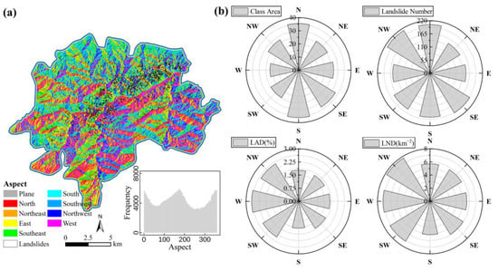 As slope increases, the number of landslides, LND, and LAD all exhibited a trend of initial increase followed by subsequent decrease (Figure 11b). The peak values for all three indicators occur within the 20–30° slope range. In this interval, a total of 555 landslides were recorded, accounting for 44.51% of total the number of landslides; the LND reached 6.15 km−2, and the LAD reached 1.77%. These findings indicate that slopes ranging from 20° to 30° in Jiangwan Town are the most susceptible to landslide occurrences.