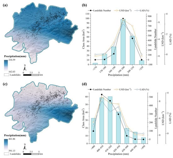 To investigate the relationship between rainfall-induced landslide distribution and influencing factors, we employ two widely used metrics: Landslide Number Density (LND) and Landslide Area Density (LAD) [,]. LND quantifies the number of landslides per square kilometer (Equation (3)), while LAD represents the percentage of landslide area within each factor category (Equation (4)).