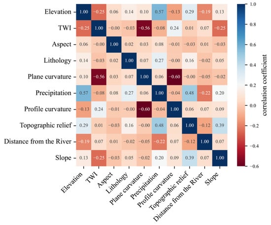 Based on the spatial distribution patterns and formation conditions of landslides within the study area, and referencing environmental factors from regions with similar geomorphic characteristics, we selected ten fundamental environmental conditioning factors: elevation, slope, aspect, plane curvature, profile curvature, topographic relief, TWI, precipitation, lithology, and distance from the river (Figure 7).
