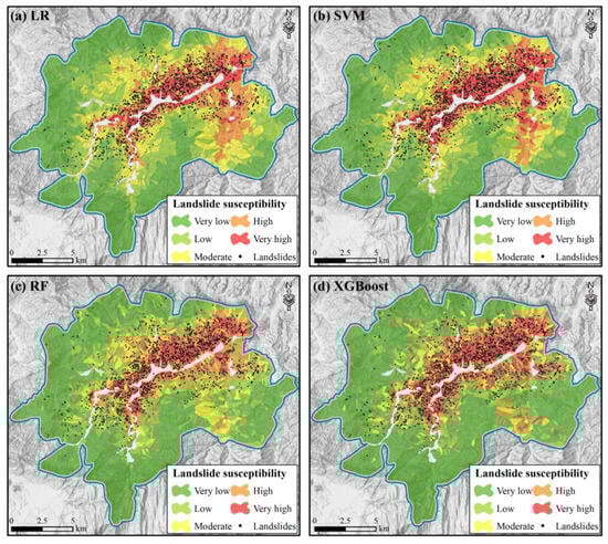 Landslide susceptibility maps generated using four different models: (a) LR; (b) SVM; (c) RF; (d) XGBoost.