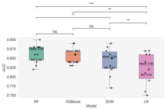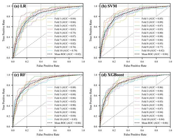 The classification performance of the four models was evaluated using Receiver Operating Characteristic (ROC) curves [,] (Figure 16). The Area Under the Curve (AUC) statistic for each model was calculated through 10-fold cross-validation, with the results summarized in Figure 17.