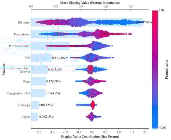 To enhance the interpretability of the landslide susceptibility model, we employed the SHAP method, based on Shapley values derived from cooperative game theory. SHAP quantifies the contribution of each feature to the model’s predictive outcomes, thereby elucidating the model’s decision-making process. This approach facilitates an understanding of how environmental factors influence landslide risk []. It not only aids in identifying and analyzing key factors governing landslide occurrence but also provides a quantitative comparison of their relative importance.