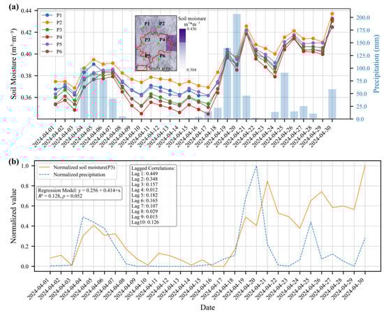 Lagged correlation between soil moisture and precipitation: (a) Daily soil moisture time-series in April; (b) Temporal trend of lagged correlation between soil moisture and precipitation at P3.