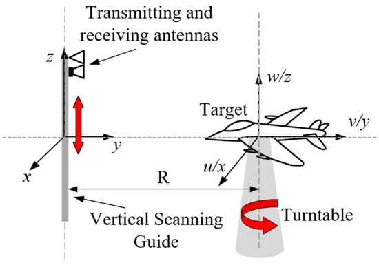 Cylindrical scanning is [3] a common 3D radar imaging technique utilized in large-scale radar cross-section (RCS) measurement systems, owing to its structural simplicity and ease of implementation, demonstrating significant adaptability in assessing the radar scattering performance of aerospace vehicles and weapon systems [4,5,6]. Cylindrical scanning is capable of reconstructing 3D radar images by acquiring electromagnetic scattering data over an approximate cylindrical surface by rotating the target at equal angular intervals along a fixed radius and ascending in elevation [7].
