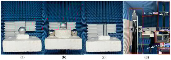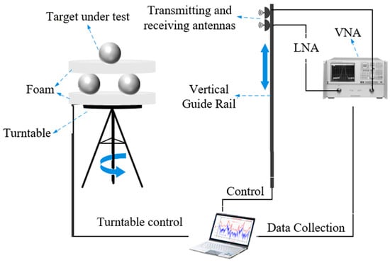 Figure 6 presents the schematic diagram of the testing system employed in this study. A stepped-frequency radar system consists of a two-port vector network analyzer (VNA), a low-noise amplifier (LNA), and two double-ridged horn antennas. A flat radar-absorbing material (RAM) is placed between the transmitting and receiving antennas to minimize the direct leakage between them. A foam pillar with a height of 10 cm is placed on a high-precision turntable, with the test target located at the center of both the foam pillar and the turntable. The VNA is operated through the instrumentation system to enable the transmission and reception of electromagnetic waves. The positions of the antennas and the turntable are adjusted continuously to enable the measurement of the cylindrical synthetic aperture. The scanning of the transmit–receive antenna pair and the rotation of the target commence simultaneously and continue at constant speeds to enable the formation of a “V”-shaped synthetic aperture.
