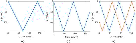 Illustration of three “V”-shaped sampling schemes: (a) sampling trajectory matrix of Scheme 1; (b) sampling trajectory matrix of Scheme 2; and (c) sampling trajectory matrix of Scheme 3.