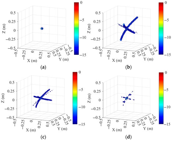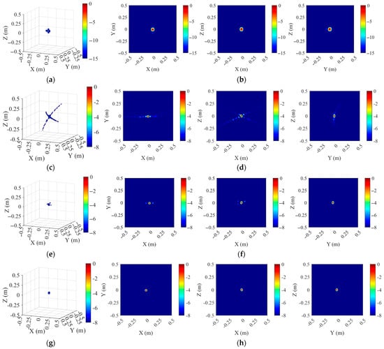 Figure 12 illustrates the point spread functions (PSFs) associated with both the cylindrical full-sampling and the proposed sparse-sampling methods. Figure 12a presents the PSF derived from conventional cylindrical full-sampling, demonstrating superior imaging performance. Figure 12b depicts the point spread function (PSF) of Scheme 1, as shown in Figure 7, characterized by a sampling trajectory that closely resembles a single “V” shape. The resultant back-projection can be interpreted as the superposition of two cylindrical lobes, creating a “X”-shaped structure. The scattering center is notably enhanced, while off-center responses are partially canceled due to constructive and destructive interference. With an increase in the number of “V”-shaped sampling trajectories, the significance of this cancellation effect escalates. As a result, the individual cylindrical structures become indistinguishable in the PSF, as illustrated in Figure 12d, where a noticeable enhancement in imaging performance is evident.