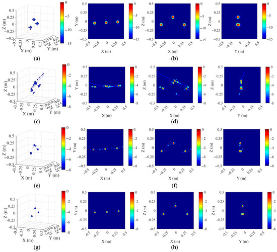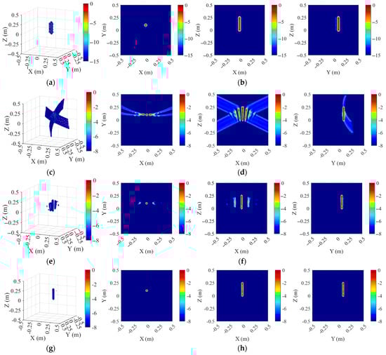 Phase compensation applied to the sampling matrices associated with various synthesized motion trajectories during measurement enables precise retrieval of the reconstructed target positions. This illustrates that the scattering measurement approach utilizing synchronized vertical scanning and azimuthal rotation of the turntable facilitates effective 3D imaging. The program was executed in MATLAB on a computer equipped with an Intel Core i7-13790F @ 2.10 GHz processor, 32 GB RAM. The program use CPU parallel acceleration. The imaging dynamic range in Figure 9c–h is uniformly set to 8 dB to facilitate a clear and intuitive comparison of the imaging performance under different sampling trajectories.
