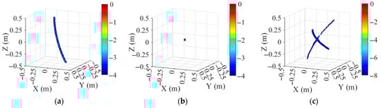 Figure 14a demonstrates improper imaging of the sphere, resulting in a singular line representation. Figure 14b illustrates the point at which the target becomes distinguishable, while Figure 14c, with an increased dynamic range, reveals an “X” shape in the image. The intersection of the two lines accurately represents the position of the target. The results indicate that a single “V”-shaped trajectory represents the minimum sampling aperture necessary for the proposed scheme to facilitate 3D imaging. The “V”-shaped path provides adequate angular diversity for localizing scatterers across all three spatial dimensions, while a single slanted trajectory is insufficient for this task.