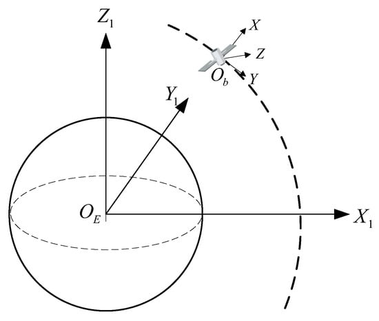 The geocentric inertial coordinate system, denoted as (), has its origin set at the center of mass of a spherical Earth. The axis is perpendicular to the equatorial plane and aligned with the direction of the Earth’s rotational angular velocity. The axis lies within the equatorial plane and points towards the direction of the J2000.0 vernal equinox. The axis is also located within the equatorial plane, and the three axes form a right-handed coordinate system. The three axes of this coordinate system do not change with time in inertial space, exhibiting constancy. This coordinate system is commonly used to describe the motion of celestial bodies around the Earth (S). The motion state of a satellite within the Earth’s gravitational field can be characterized through orbital dynamics equations in this coordinate system, as illustrated in Figure 1.