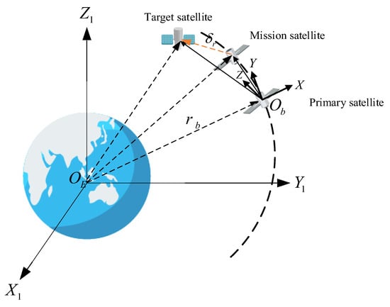 In a region of near-Earth orbit where distances are close, a virtual reference satellite (primary satellite) is selected, and its orbit serves as the reference orbit. The center of mass of the reference satellite is taken as the origin of the coordinate system to establish a satellite orbital coordinate system , as illustrated in Figure 2. In the coordinate system of the reference satellite, the equations of motion of a satellite relative to the reference satellite can be expressed as: