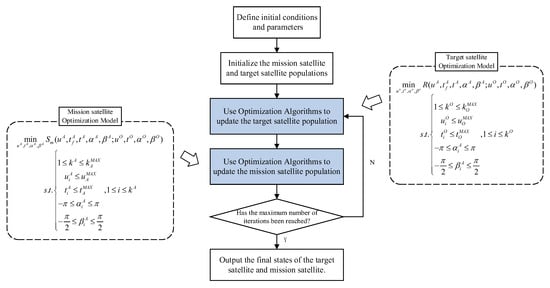 The core idea of co-evolution is the joint evolution of the mission satellite population and the target satellite population through mutual influence. For each individual mission satellite, the individuals with the optimal loss functions are selected from the target satellite population. The mission satellite then competes against these target satellites individually, and the average value of the mission satellite’s loss function is recorded as its individual loss function. Similarly, for each individual target satellite, the individuals with the optimal loss functions are selected from the mission satellite population. The target satellite then competes against these mission satellites individually, and the average value of the target satellite’s loss function is recorded as its individual loss function. Through this setup, both the target satellite and mission satellite populations update themselves based on the optimal individuals from the opposing population. The two populations compete with each other and optimize individually. Eventually, when the competition reaches a stable state, the optimal solution to the differential game model is obtained, and the iteration termination condition is met.