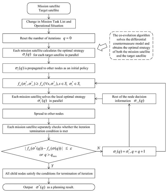 The objective of the planning is to minimize . Regarding the multi-satellite collaborative detection mission system, the Nash equilibrium strategy set requires that all participating mission nodes in the system satisfy the following condition:
