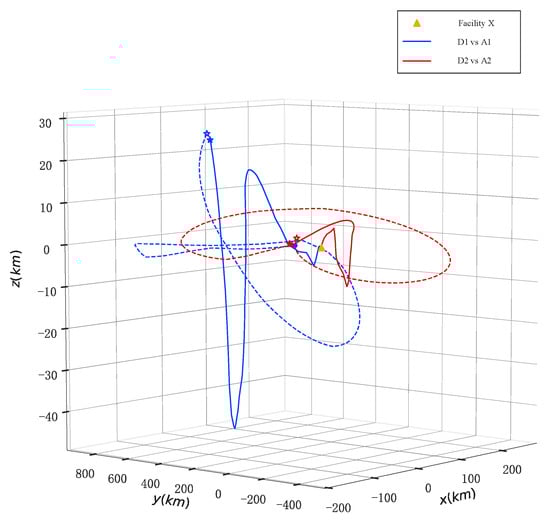 Figure 7 shows the operational trajectories of two detection satellites (A1–A2) and two intelligent satellites (D1–D2) in three-dimensional orbital space. Solid and dashed lines of different colors represent the orbital paths of different numbered detection and intelligent satellites. The figure clearly demonstrates that each intelligent satellite achieves a relatively favorable deployment position through strategic maneuvers, effectively avoiding potential collisions with detection satellites. Meanwhile, the corresponding detection satellites attempt to obtain optimal observation conditions through complex maneuver trajectories to accomplish their missions. This dynamic process reflects the game characteristics between the two parties in orbital space and reveals the importance of orbital maneuvers and coordinated deployment in achieving detection missions.