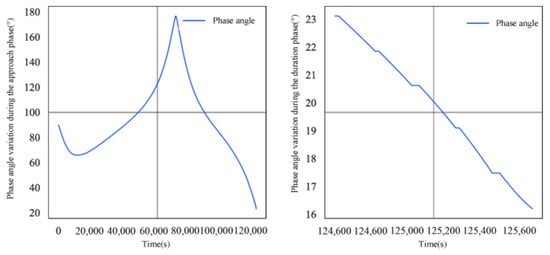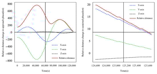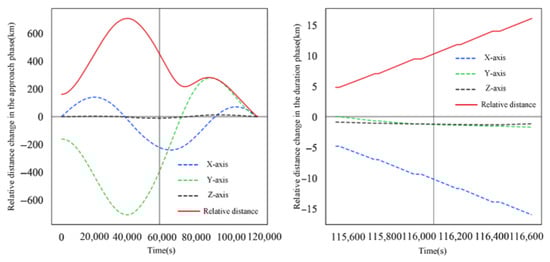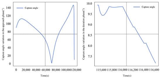 Figure 10 and Figure 11 show the dynamic changes in relative distance and capture angle between intelligent satellite D2 and detection satellite A2 during the approach and sustained phases of evasion.
