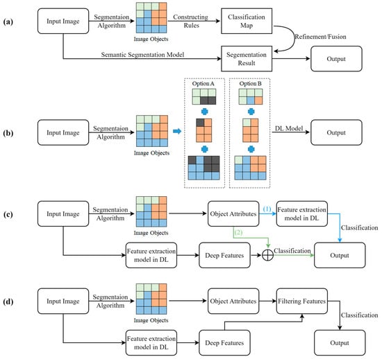 Image segmentation and classification constitute the core processes of GEOBIA, where segments contain rich spectral, textural, morphological, and remote sensing index attributes that facilitate the recognition of complex targets in remote sensing imagery. However, the irregular shapes of these segments pose significant challenges for their integration into deep learning frameworks []. Based on an extensive literature review, existing integration strategies can be broadly categorized as follows (see Figure 1):