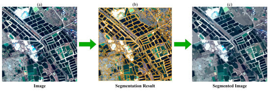Processing flow of the EIODA algorithm. (a) Original remote sensing image; (b) overlay of the EIODA segmentation result on the original image; (c) display of the segmented image, where the pixel values in the R, G, and B channels represent the spectral mean values of the segment.