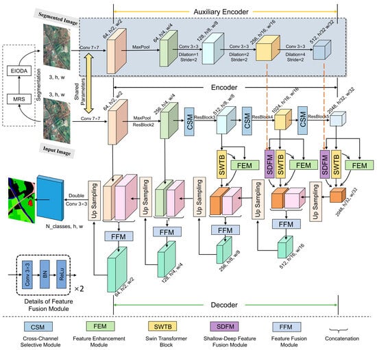 In the auxiliary branch, after the original remote sensing image is processed by the EIODA segmentation algorithm, a segmented image is obtained. The auxiliary encoder shares the weights of the first layer with the main encoder. It is then processed through three dilated convolutions. The output of the n-th stage can be represented as , where n 2, C3 = 128.
