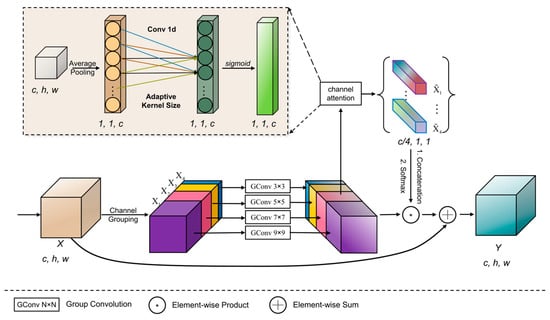 means concatenation on the channel dimension, and ʘ stands for element-wise product. First, the feature map X obtained from the Resblock is divided into channels according to a specified ratio. In this work, an equal division is employed, with the ratio r1:r2:r3:r4 = 1:1:1:1, resulting in feature maps ,, , and. Next, each of these feature maps undergoes group convolutions with different numbers of groups (g1, g2, g3, g4 = 1, 4, 8, 16) and kernel sizes (3 × 3, 5 × 5, 7 × 7, 9 × 9), producing outputs ,, , and, respectively. Subsequently, each is processed through a channel attention block that uses adaptive-sized 1D convolutional kernels to improve cross-channel communication within each group. The adaptive convolutional kernel sizeis calculated using the following formula: