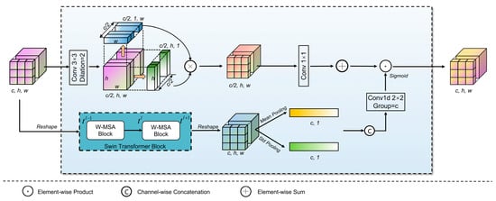 In terms of the overall network architecture, a dual-branch structure with both CNN decoders and Transformer decoders is not utilized, as this would significantly increase the model complexity. Instead, the SWTB is integrated into the intermediate and deep layers of the network to ensure the preservation of global information. It is worth noting that the features of skip connections are not enhanced by CSM, as this may interfere with the capability of the SWTB to capture global information. To effectively apply global contextual features to the channel attention mechanism of CNN feature maps, we designed the FEM. It emphasizes the channels crucial for capturing global semantic information while suppressing irrelevant features. This design improves the model’s generalization ability and robustness across different data distributions. The structure is illustrated in Figure 6. As previously mentioned, Tn and Wn denote the outputs of the n-th layer Resblock and SWTB, respectively. FEM adopts a dual-path structure to enhance feature representations by capturing both spatial and channel dependencies. The spatial path applies a 3 × 3 dilated convolution followed by directional pooling to extract horizontal and vertical contexts, which are fused into a spatial attention map. The channel path reshapes the input and employs Swin Transformer blocks to extract global context, followed by mean and std pooling across spatial dimensions. The pooled statistics are concatenated and passed through a group-wise 1D convolution and sigmoid to generate channel attention. The two attention maps are fused and applied to the input via element-wise multiplication to refine features. This entire process can be encapsulated by the following equation: