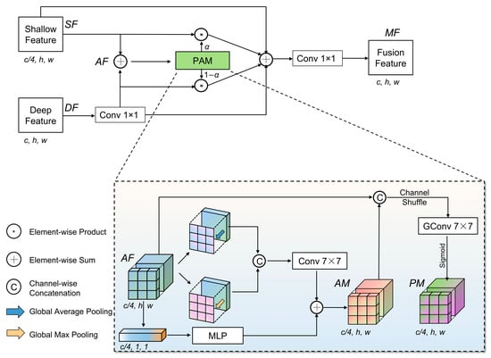 where MLP denotes the fully connected layer, while GAP and GMP represent the calculation of the mean and maximum values of pixel space along the channel dimension, respectively. The AF and AM are cross-arranged along the channel dimension. Pixel-wise attention maps (PM) are then generated by applying a 7 × 7 grouped convolution followed by a sigmoid function. The PM is then multiplied by the SF and DF using the weight factor α and summed to produce the fused features (MF), as described in Equation (6). The channels are subsequently restored to the size of DF using a 1 × 1 convolution. The default value for α is 0.5.