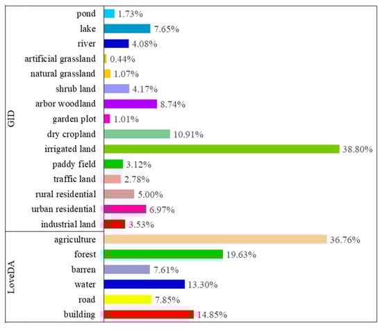 Percentage of each semantic label in the GID and the LoveDA dataset.