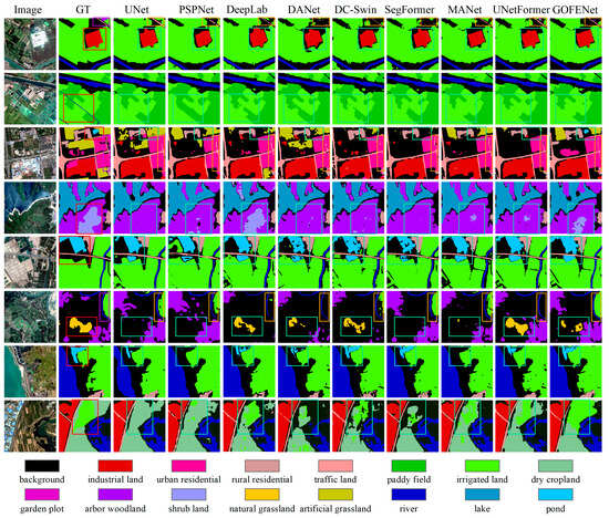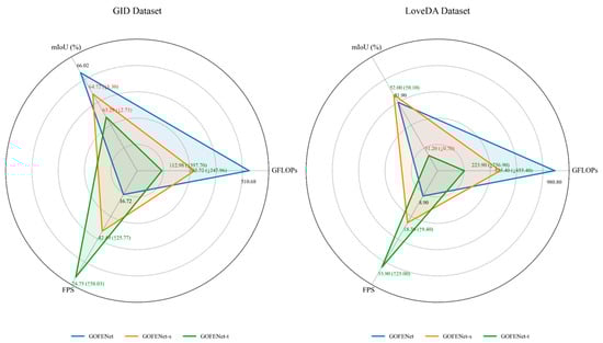 The models are trained using the PyTorch 2.0 framework, with all experiments performed on an NVIDIA RTX 3090 GPU with 24 GB of memory. To expedite convergence, the AdamW optimizer is employed with an initial learning rate of 0.0001, adjusted according to the yolox_warm_cos_lr schedule []. To facilitate efficient model, images from the GID and LoveDA datasets are cropped to a non-overlapping size of 512 × 512 pixels, discarding any excess portions. Various data augmentation techniques are applied during training, including random scaling within the range of [0.8–1.2], random vertical and horizontal flips, random rotations, and color enhancements, with a batch size of 8. The maximum number of training epochs is established at 300 for the GID and 100 for the LoveDA dataset.