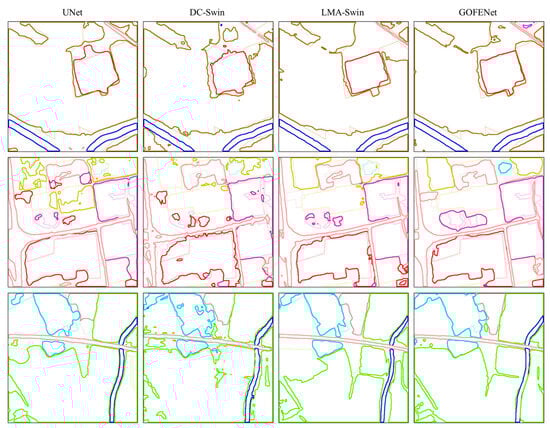 Table 1 demonstrates that the introduction of an auxiliary encoding branch, using optimally segmented input images, results in improvements in mIoU, OA, and mPA on the GID by 0.56%, 0.53%, and 0.54%, respectively. On the LoveDA dataset, mIoU increases by 0.83%. Figure 11a provides a clear visual comparison of the segmentation results before and after integrating the SDFM into the baseline model. In the first and second rows, it successfully preserves the boundaries and structural integrity of various land cover types. The third and fourth rows demonstrate that, unlike the FEM, SDFM maintains the separability of distinct land cover classes—such as buildings and water bodies—preventing their erroneous merging into a single entity.