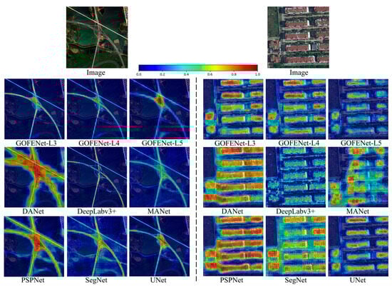 Furthermore, the joint effects of different modules on segmentation results within the baseline framework are explored on both datasets, as shown in Table 1. For the GID and the LoveDA dataset, introducing both CSM and FEM together improve segmentation results by 2.55% and 1.98% mIoU, respectively. Notably, even without incorporating the SDFM, the Baseline + CSM + FEM configuration achieves consistently strong results across both datasets. This demonstrates that the CNN–Swin Transformer hybrid design (CSM + FEM) alone can effectively learn discriminative and robust representations, making it potentially applicable to other vision tasks. When both CSM and SDFM are used, segmentation results increase by 1.84% and 2.36% mIoU, respectively. Considering both FEM and SDFM together result in mIoU increases of 1.66% and 2.66%, respectively. Based on the baseline framework, the proposed GOFENet, which integrates the three key modules (CSM, FEM, and SDFM), achieve mIoU improvements of 3.29% and 3.08% on the respective datasets.