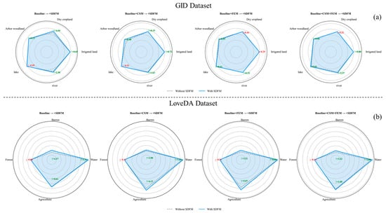 According to the experimental results, the deep learning semantic segmentation framework integrating GEOBIA can elevate segmentation accuracy and refine boundary information to some extent. We explore the effect of integrating segmentation maps via the SDFM on the classification of large-scale land cover categories. As illustrated in Figure 8, our analysis focuses on the dominant classes with the largest pixel coverage in the GID and the LoveDA dataset. Specifically, these include Irrigated Land, Dry Cropland, Arbor Woodland, Lake, and River in GID (Figure 18a), and Agriculture, Forest, Water, and Barren in LoveDA (Figure 18b). Overall, the integration of the SDFM enhances segmentation accuracy for large-scale land cover types. In the GID, although a few categories showed slight performance declines due to external factors, these decreases were limited and did not offset the overall improvement. Notably, the Forest class in the LoveDA dataset exhibited a consistent decline across all four model configurations, likely due to its fragmented and discontinuous spatial distribution, which hindered effective spatial fusion. These results indicate that integrating GEOBIA-derived segmentation priors significantly enhances the model’s capacity for global feature extraction, thereby improving its ability to accurately identify and delineate extensive and spatially coherent land cover categories.