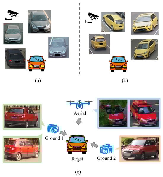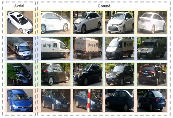 Intelligent visual surveillance has recently attracted significant attention in broad real-world applications, particularly in smart remote sensing systems [,]. Among these, vehicle re-identification (Re-ID) is a key task []. Vehicle Re-ID aims to locate images of the same vehicle instance across non-overlapping camera views, typically based on instance-level ID annotations rather than category labels [,]. This task has garnered considerable attention and has made significant advancements in recent years []. Current vehicle Re-ID research predominantly concentrates on data collected from stationary cameras positioned on urban roads, where camera perspectives are relatively consistent []. Although progress has been made in vehicle Re-ID in intelligent transportation in recent years [,], there is a lack of benchmark datasets and baselines for aerial-ground collaborative vehicle Re-ID in remote sensing.