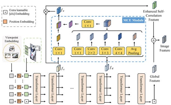 The framework of our proposed Enhanced Self-Correlation Feature Computation. The input images are processed for feature extraction using a Transformer-based architecture. The proposed enhanced self-correlation feature computation method can be integrated into the Transformer structure, taking both high- and low-level Transformer layer outputs as inputs. These are then passed through the MCE module to obtain enhanced features. The enhanced features, combined with the low-level features, are used to compute enhanced self-correlation features. The enhanced self-correlation features, along with the global features, are then fused to generate the image features used for classification and loss computation. denotes the deep features, stands for the shallow features, and refers to the enhanced features.