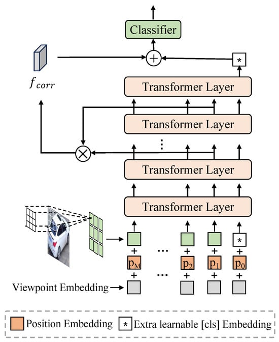 This task is related to cross-view image matching, particularly aerial-ground geo-localization, where the severe differences in viewpoints present significant challenges. Lin et al. [] and Liu et al. [] addressed scene-level alignment between aerial and ground views through deep feature learning and orientation-aware modeling. Although their approaches primarily target scene-level geo-localization, the strategies they employ offer valuable insights for handling extreme perspective discrepancies. In addition to vision-based approaches, fine-grained identification tasks have also been studied in other sensing modalities. For instance, in the field of radar signal recognition, Dudczyk et al. [] proposed a data particle geometrical divide algorithm to improve specific emitter identification, enabling more accurate recognition of individual radar sources. These developments demonstrate the broader relevance of individual-level recognition techniques across different sensing domains and motivate further research into cross-modality Re-ID. In contrast, our work focuses on fine-grained, instance-level matching—an aspect that remains relatively underexplored in the current literature. While existing Re-ID methods can address multi-view scenarios, they are predominantly trained on images captured from cameras positioned at similar heights [,,,]. Moreover, recent methods in vehicle Re-ID often employ multi-layer transformer architectures to learn global representations. However, they frequently overlook shape-based cues, which are essential for differentiating vehicle instances across dramatically varying perspectives [,,]. In typical multi-layer transformer architectures, shallow layers tend to capture low-level features such as edges and textures, whereas deeper layers encode high-level semantics and global context, enabling the modeling of long-range dependencies []. Despite this hierarchical capability, many transformer-based Re-ID approaches [,] rely exclusively on the final-layer token for global feature representation. This practice neglects the rich local information embedded in earlier layers and the potentially informative outputs from other spatial positions within the feature map.