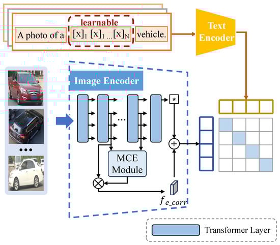 The integration of enhanced self-correlation features in CLIP-ReID []. The enhanced self-correlation features are incorporated into the image encoder, overlaying the original image features without altering the other components, including the text encoder.