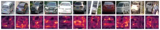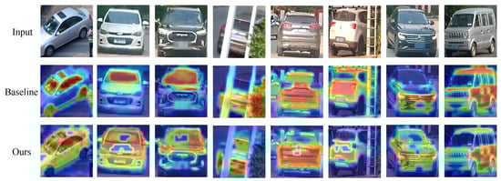 We utilized the Score-CAM [,] for attention visualizations, as depicted in Figure 8, where the baseline is used for comparison. In contrast to the baseline, which in some cases overly focuses on the surrounding environment or fails to adequately highlight the distinctive parts of the vehicle, our method effectively redirects scattered attention from the background to the vehicle itself, paying more attention to the vehicle regions that contribute to differentiation.