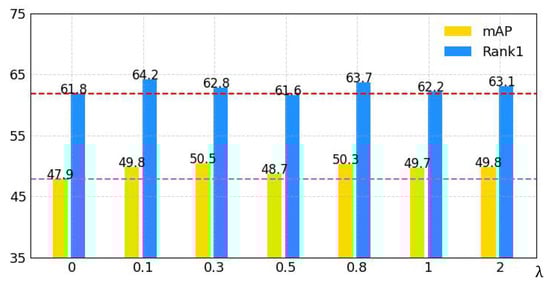 We analyzed the effect of the enhanced self-correlation feature weight on model performance in Figure 9. When = 0, the self-correlation feature is not used, which represents the baseline of this paper. The results show that the model achieves optimal performance when = 0.8, with mAP of 50.3% and Rank-1 of 63.7%. For the mAP metric, improvements were observed for all tested values of , indicating that the proposed enhanced self-correlation feature effectively complements image additional information and improves model performance. When = 0.5, the Rank-1 score decreased by 0.2%, but the mAP increased by 0.8%, suggesting that this proportion of feature integration is more beneficial to overall performance improvement.