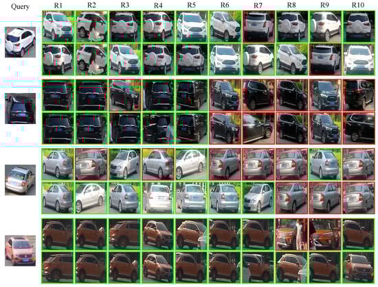 VeRi []. The VeRi dataset contains diverse traffic scenes captured by 20 cameras within an urban area, spanning approximately one square kilometer with various perspectives. The dataset has a total of 49,357 images of 776 different vehicles. Each vehicle is captured by 2 to 18 cameras, resulting in images with different viewing perspectives, illumination, occlusion, and resolution. To facilitate evaluation, the dataset is split into a training set (37,778 images of 576 vehicles) and a test set (11,579 images of 200 vehicles). Within the test set, 1678 images of the 200 vehicles are designated as the detection set, with the remaining images serving as the candidate set.