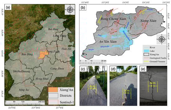 The establishment of the Xiong’an New Area (XNA) is one of the strategic responses to promote the coordinated development of densely populated cities in the Beijing–Tianjin–Hebei urban agglomeration, which is located in the North China Plain []. The urbanization process of the XNA has continued since 1 April 2017, with the planning and construction broadly divided into three periods, and its total development area has expanded from 100 km2 at the initial stage to 202 km2 currently []. However, the geo-environmental risks faced by the XNA have still not been accurately assessed, which is especially importance since there is a long history of geothermal energy extraction and groundwater pumping in the area, which is a common trigger for ground subsidence hazards []. And previous studies show that the obvious uneven settlement and ground crack disasters in the area have threatened the infrastructure safety, urbanization process, and sustainable development of the XNA. Therefore, it is necessary to monitor surface deformation and analyze the spatial and temporal evolution of ground settlement and ground fissures in the XNA.