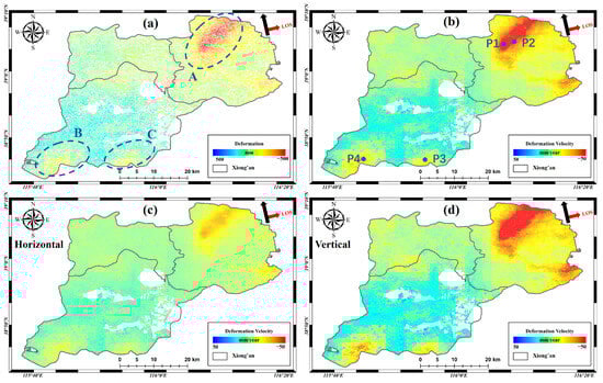 Cumulative LOS deformation and average annual deformation rates in Xiong’an New Area derived from Sentinel-1A data (2017–2025): (a) cumulative deformation along the LOS direction; (b) average annual deformation rate along the LOS direction; (c) average annual deformation rate in the east–west direction; and (d) average annual deformation rate in the vertical direction.