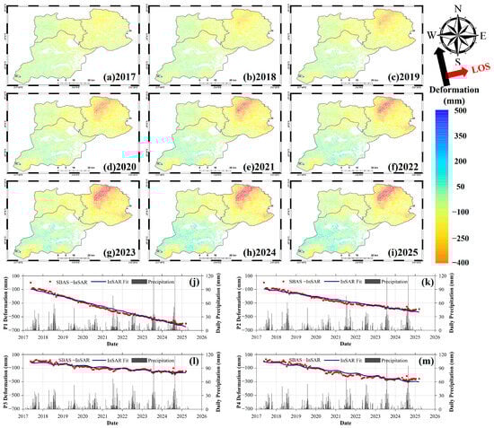 InSAR-derived deformation time series in Xiong’an New Area: (a–i) cumulative deformation maps for each year from 2017 to 2025; and (j–m) deformation time series extracted at points P1, P2, P3, and P4.