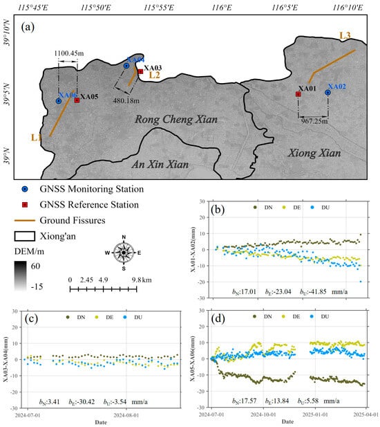 Field investigations reveal that ground fissures in the study area are predominantly distributed across three zones: (1) Daying Town, Zhugezhuang Township, and Xiongzhou Town in Xiong County; and (2) the surrounding areas centered on Nanzhang Town, Dahe Town, and Jiaguang Township in Rongcheng County. These fissures manifest as irregular circular/elliptical collapse pits or linear subsidence belts, with significant scale variations. While exhibiting diverse local orientations, they dominantly align along a north–south strike direction. To characterize deformation patterns across fissure zones, we deployed paired GNSS stations (XA01-XA06) on both eastern and western sides of three representative fissures: XA01/XA02 in Daying Town, XA03/XA04 in Jiaguang Township, and XA05/XA06 in Nanzhang Town (Figure 6a). For the spatial analysis, XA01, XA03, and XA05 were designated as reference stations to form three baselines with their adjacent counterparts (XA02, XA04, XA06), spanning 480.8 m (shortest) to 1100.45 m (longest). This short baseline configuration (<1.5 km) ensures optimal observation sensitivity to localized differential movements.