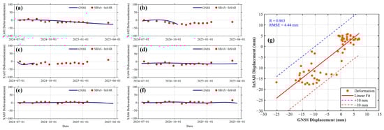 Comparison of cumulative LOS deformation derived from InSAR and GNSS at each monitoring site: (a–f) LOS deformation time series obtained from InSAR and GNSS; and (g) correlation coefficients and RMSE between InSAR and GNSS LOS deformation measurements.