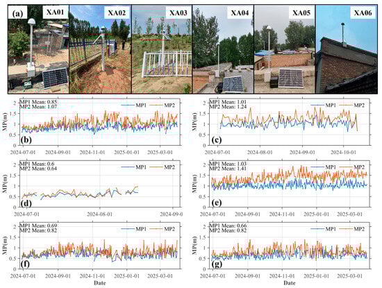 Quality check of GNSS observation data multipath effect: (a) real photo of each GNSS station; and (b–g) assessment results of multipath effect for stations XA01~XA06.