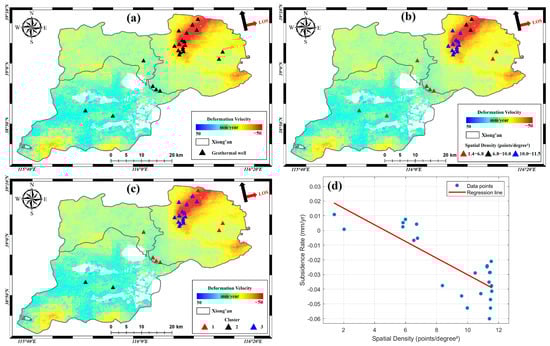 InSAR deformation rates and spatial distribution of geothermal wells in XNA: (a) spatial distribution of geothermal wells; (b) spatial density of geothermal wells, the different colors show their spatial density differences; (c) cluster analysis of spatial density and deformation rates; and (d) correlation between spatial density and deformation rates.