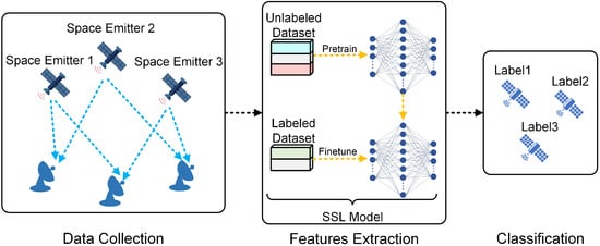 However, most existing DL-based SEI methods depend on supervised learning, requiring large amounts of precisely labeled data for effective training. In practical applications, especially for satellite signal data, obtaining reliable annotations during data acquisition is often challenging, resulting in scarce, accurately labeled samples. Consequently, the proportion of effectively labeled data is typically low, making the application of conventional supervised learning methods difficult under such constraints. To address the issue of limited labeled training samples, Few-Shot Learning (FSL) has recently been introduced to SEI. Ref. [20] applied meta-learning to SEI, directly utilizing I/Q data for training to reduce manual preprocessing steps. Validated on data collected from ZigBee devices and drones, this method achieved optimal performance with only 15 samples per class. Ref. [21] improved a meta-learning algorithm to better handle high-dimensional input data by calculating the distance and scatter between features, using this information to predict emitters. Compared to traditional meta-learning, the enhanced algorithm incorporates richer signal information to extract higher-quality, low-dimensional features. Ref. [22] proposed a novel FSL-SEI method based on Deep Metric Ensemble Learning (DMEL). Leveraging Complex-Valued Convolutional Neural Networks (CVCNNs) combined with contrastive loss and SoftMax loss, it extracts discriminative features characterized by compact intra-class distances and separable inter-class distances, ultimately enabling ADS-B signal identification via an ensemble classifier.