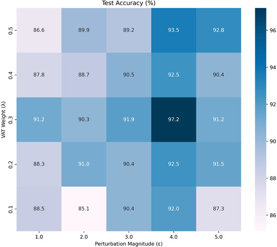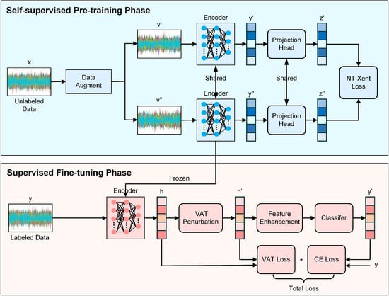 Specifically, after the SSL phase, freeze parameters of the encoder f ( · , θ ) as the feature extraction network, where θ is the frozen parameters. Then, VAT is introduced in the feature space. The specific process is as follows: first of all, sample random noise d N ( 0 , ξ 2 I ) , where ξ = 10 6 for initialization. Then, for the feature vector h = f ( x ; θ ) R 256 output by the frozen encoder, the adversarial direction is generated through iterative gradient ascent: