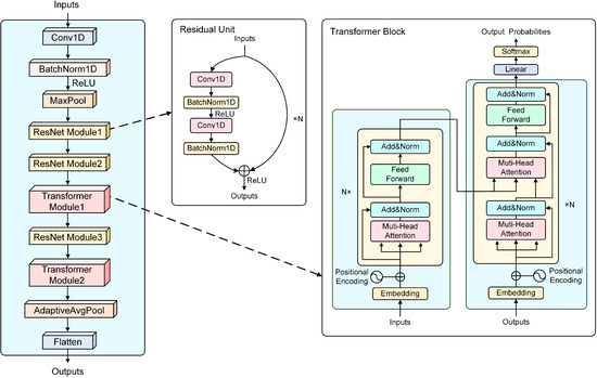 The proposed hybrid encoder stacks three ResNet modules and two Transformer modules to hierarchically extract discriminative RFFs, capturing both local features and global temporal dependencies. The three ResNet modules consist of {2, 4, 2} basic residual units, respectively. Each basic residual unit contains two 1D convolutional layers with 7 × 1 kernels, followed by BN and ReLU activation. Skip connections are incorporated to mitigate gradient vanishing, while adaptive downsampling is applied in the first unit of each module via a 1 × 1 convolutional layer when the stride or channel dimension changes. After the second and third ResNet modules, Transformer modules with positional encoding and multihead self-attention mechanisms are, respectively, inserted to model long-range interactions in the time domain. The following details the positional encoding and multihead self-attention mechanisms.