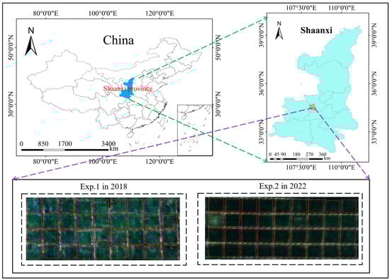 Field experiments on winter wheat were conducted in Qian County, Shaanxi Province, China (108°07′E, 34°38′N), in 2017–2018 and 2021–2022 (Figure 1). Each experimental plot covered an area of 90 m2 (9 m × 10 m), and a total of 36 plots were established in each season, resulting in 72 plots across the two experiments. The plots were designed with three N treatments, three phosphorus (P) treatments, and three potassium (K) treatments. All fertilizers were applied as basal fertilizer prior to planting, with no further fertilization occurred after planting. Winter wheat in this study was not irrigated and was planted according to local standard density. The management practices followed the conventional local standards, and any significant weed and insect infestations were recorded. Specific details of the two experiments are outlined in Table 1.